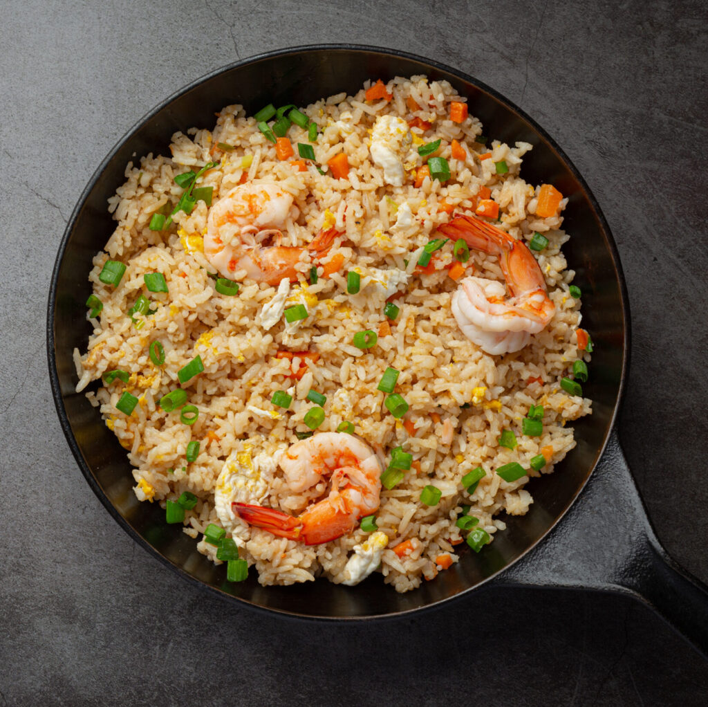 Stir-fried rice with freshly grilled shrimp, mixed vegetables, and a touch of soy sauce.